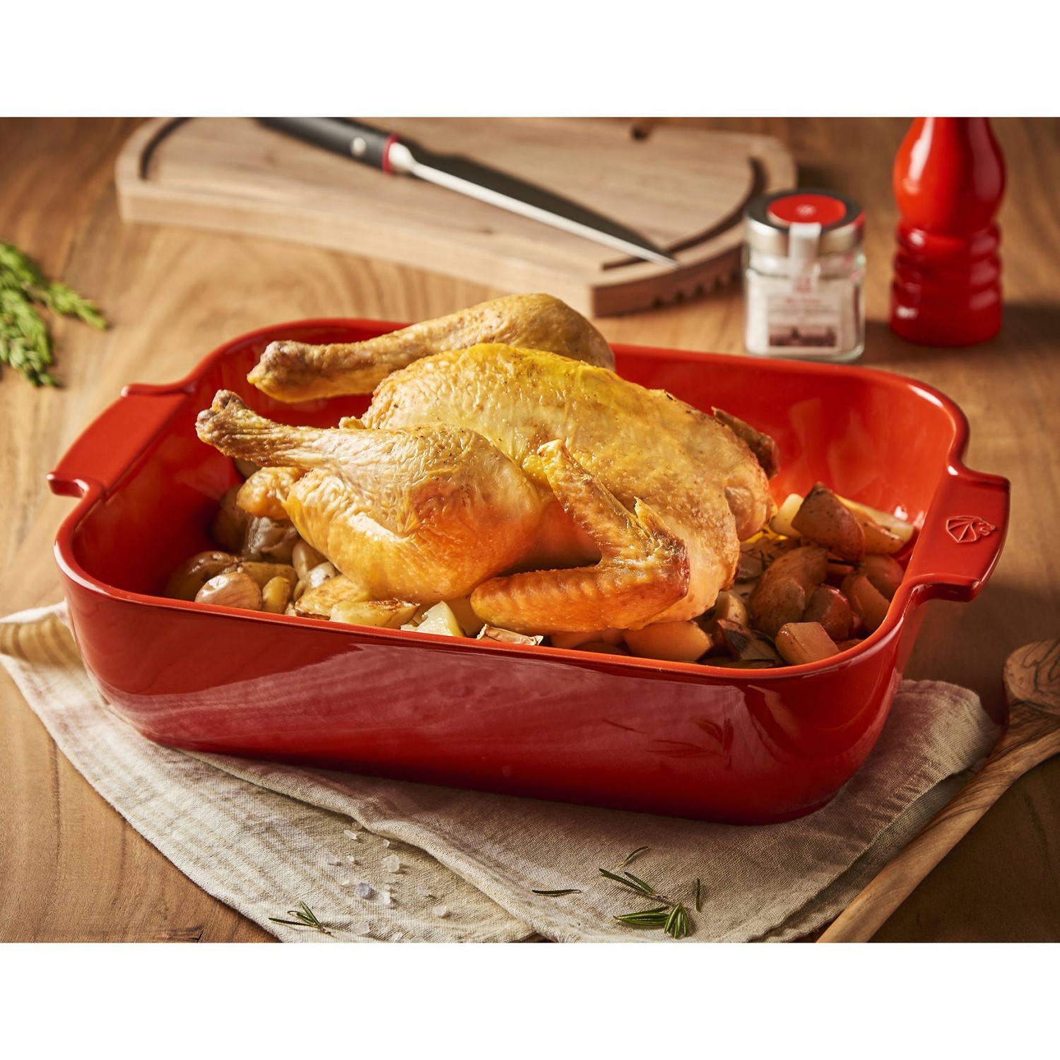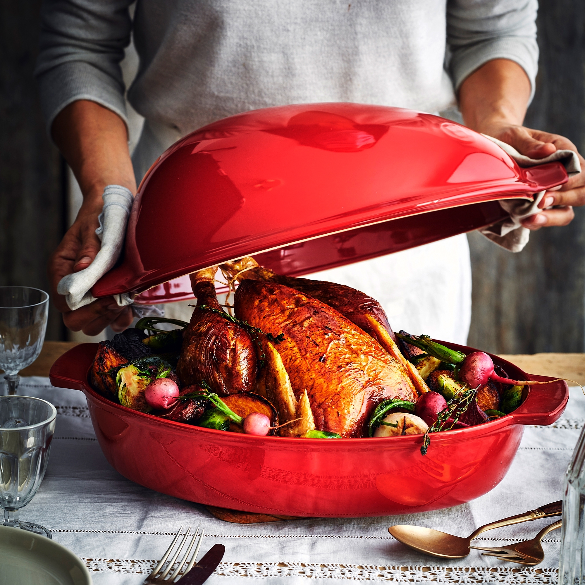 Для тих, хто шукає варіант для більшої компанії, ідеально підійде Гусятниця керамічна з кришкою Emile Henry Ovenware, об’ємом 5,8 л, червоного чи ніжного кремового кольорів. Виготовлена з інноваційної кераміки HR® (High Resistance), вона рівномірно розподіляє тепло й зберігає природну вологу. Така ємність підходить для курки, гусака, качки, овочів чи ароматних рагу.