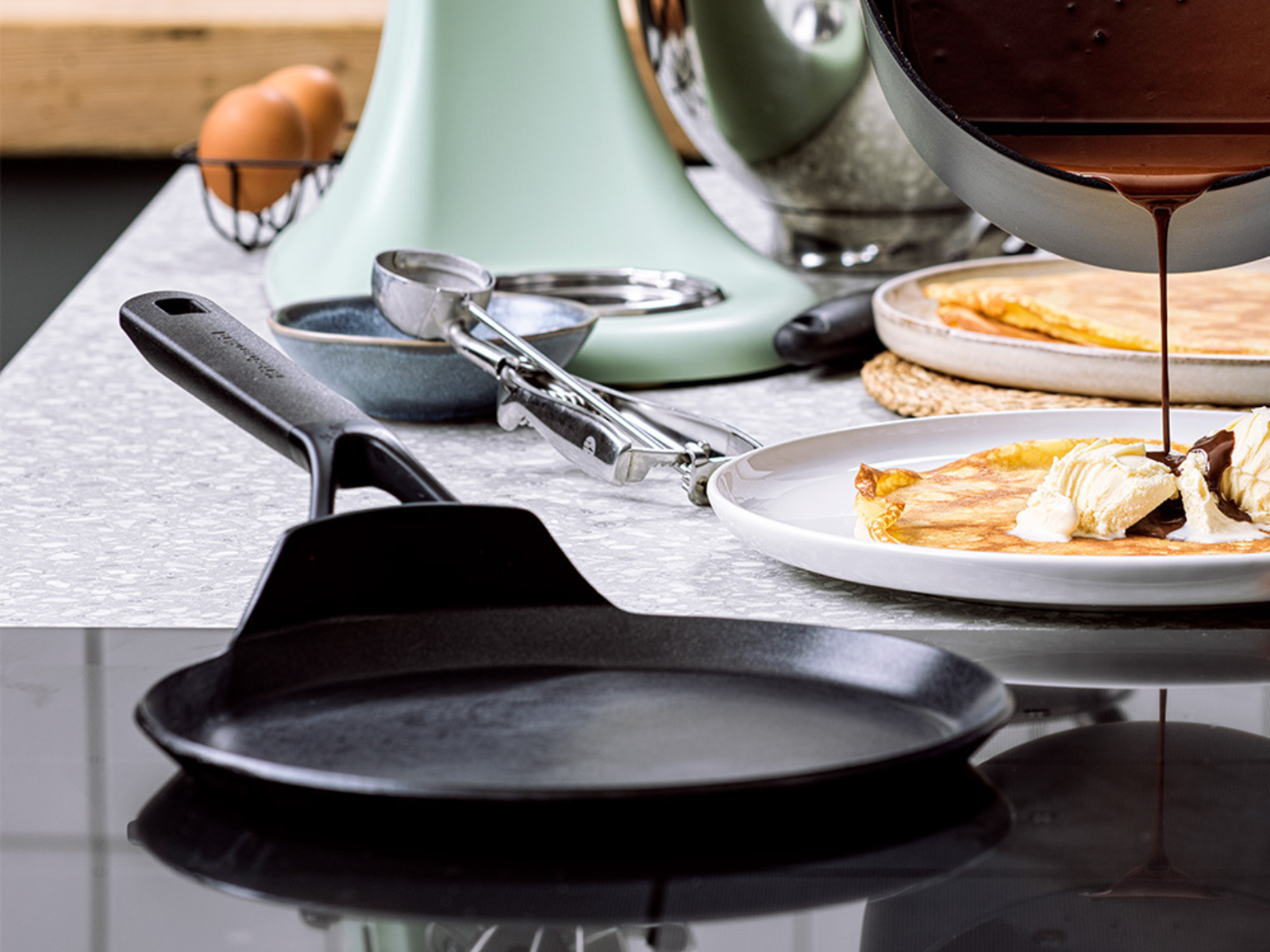 Коли йдеться про преміальні сковорідки для млинців, варто орієнтуватися на бренди з репутацією. KitchenAid відомий продуманою ергономікою та надійними матеріалами — їхні моделі комфортні у щоденному використанні та добре працюють із тонким тістом. KitchenAid CFA (24 см) добре тримає температуру й комфортна для щоденних сніданків.