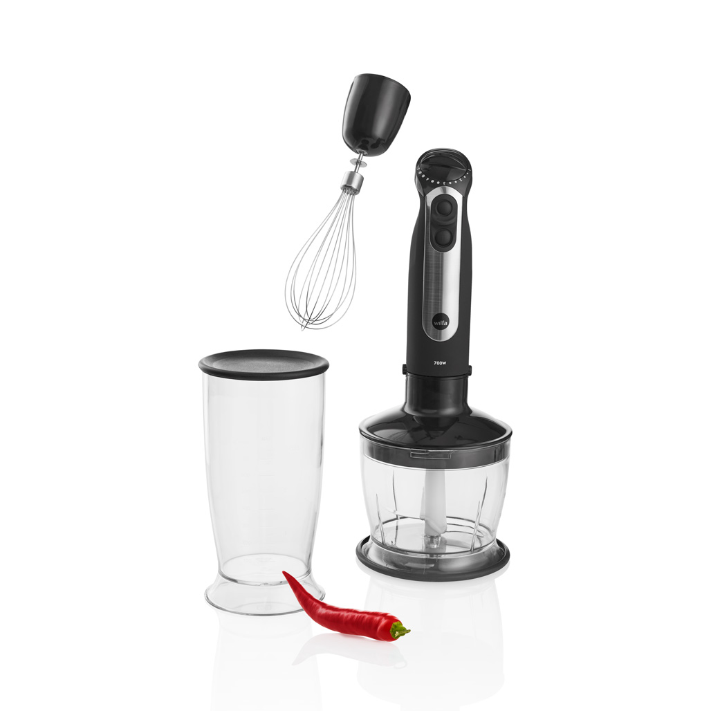 Цей універсальний прилад стане незамінним на кухні: у комплекті ви знайдете занурювальний блендер, вінчик, подрібнювач і мірну чашу з кришкою — усе для того, щоб ви могли швидко та легко готувати супи-пюре, соуси, креми, збивати вершки або навіть подрібнювати горіхи.