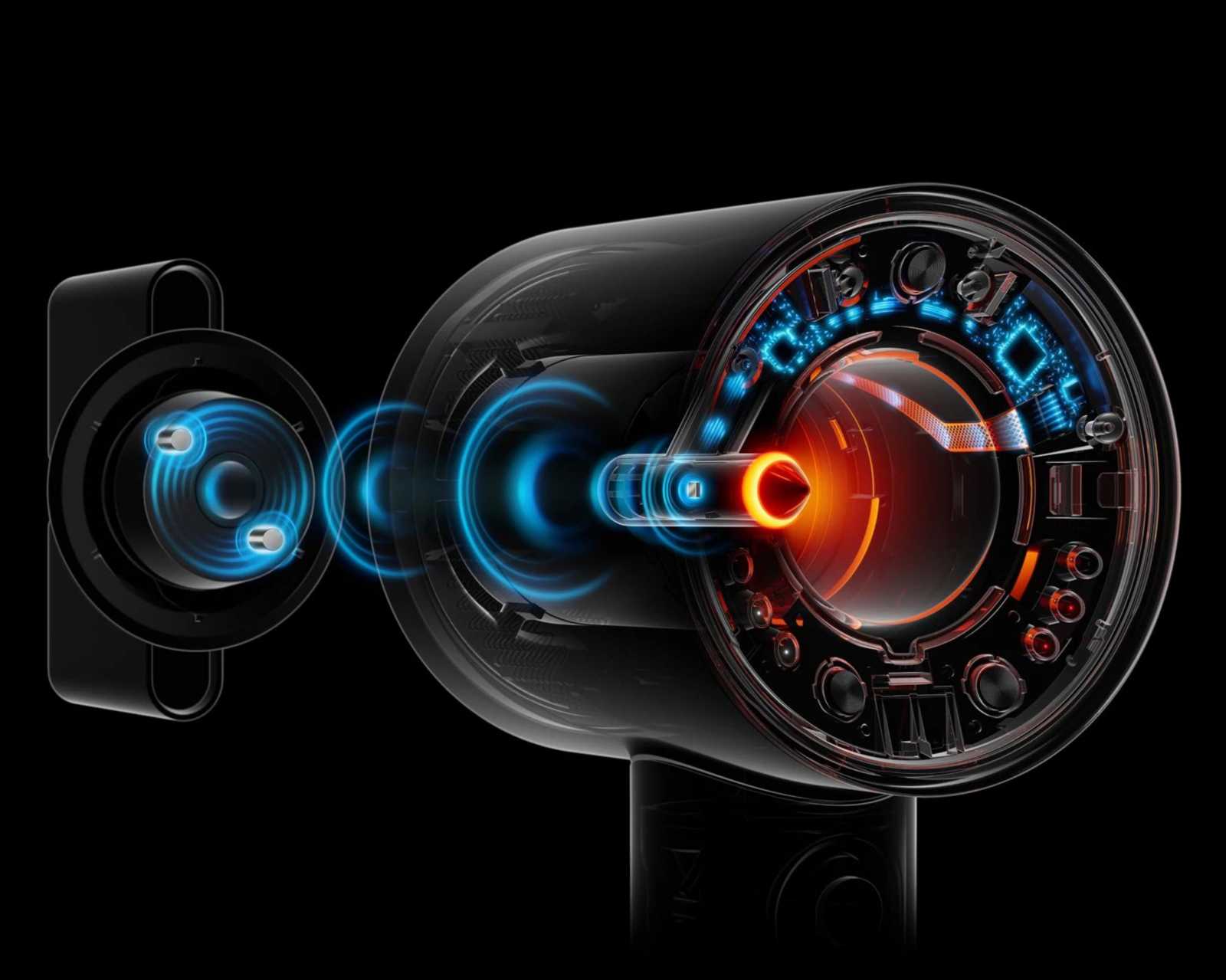 Інтелектуальна функція Pause Detect розпізнає, коли фен відкладають, і автоматично вимикає нагрівання, знижуючи шум і споживання енергії. А підсвічування капсули змінює колір залежно від температури повітря — від прохолодного синього до теплого червоного, дозволяючи візуально контролювати режим роботи.
