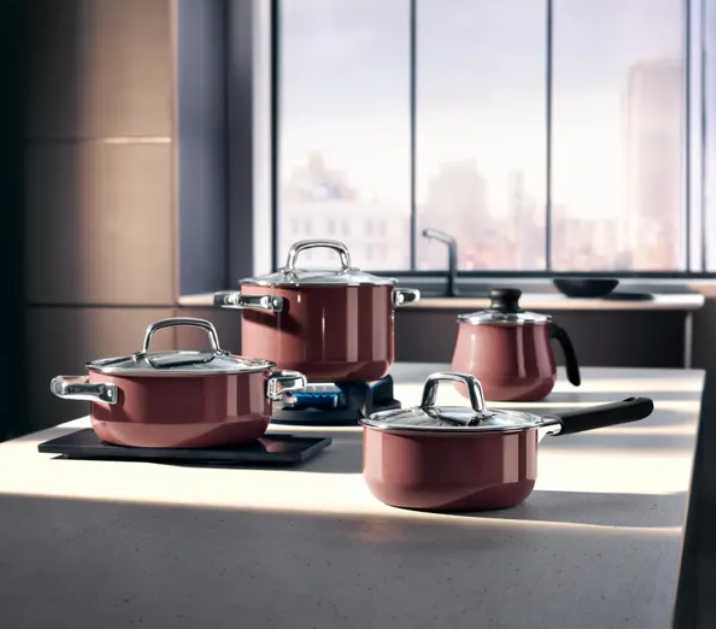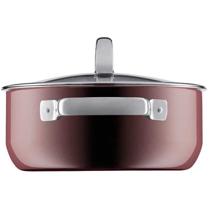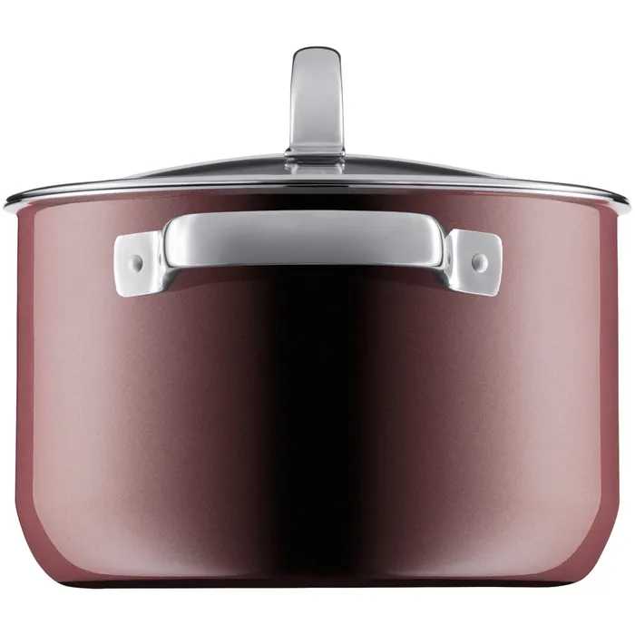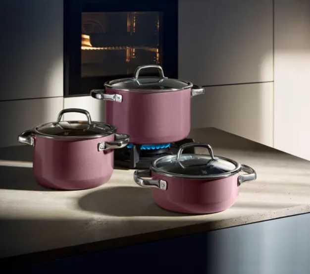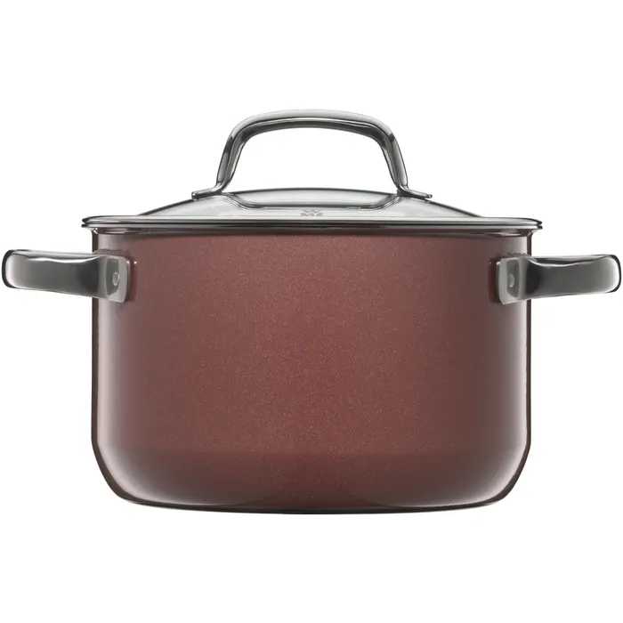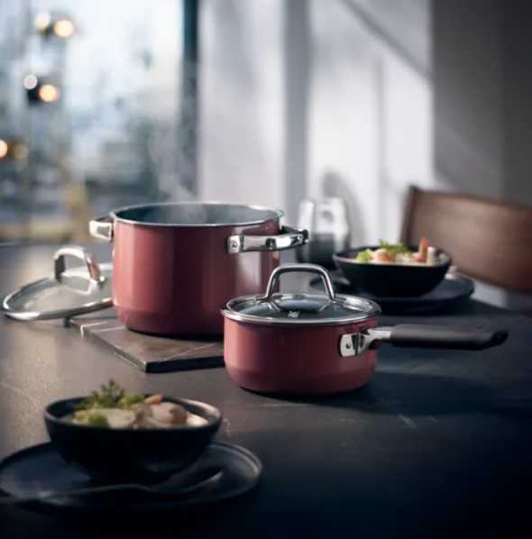 Компанія WMF зібрала всі необхідні кухонні аксесуари в одному наборі. В комплекті - 8 предметів: 2 каструлі діаметром 20 та одна - 24 см, сотейник (Ø 16 см) і 4 кришки, за допомогою яких ви з легкістю приготуєте улюблені страви. Стильні скляні кришки оснащені силіконовим кільцем, яке щільно прилягає і не дозволяє пару виходити. Завдяки технології Cool+ ви захищені від опіків, адже ручки залишаються холодними. Предмети набору виконані з кераміки високої якості, а також з запатентованого матеріалу Fusiontec, що представляє собою поєднання керамічних частинок і особливої сталі. Такий матеріал стійкий до корозії, не вбирає запахи, не містить нікель і є гіпоалергенним. Fusiontec і чавун мають аналогічні функції приготування, але при цьому Fusiontec набагато міцніше і краще за якістю. Простий, мінімалістичний і стильний дизайн підійде для кожної кухні. Приглушений червоний колір каструль стане яскравим акцентом інтер'єру. Гарантія виробника - 30 років.